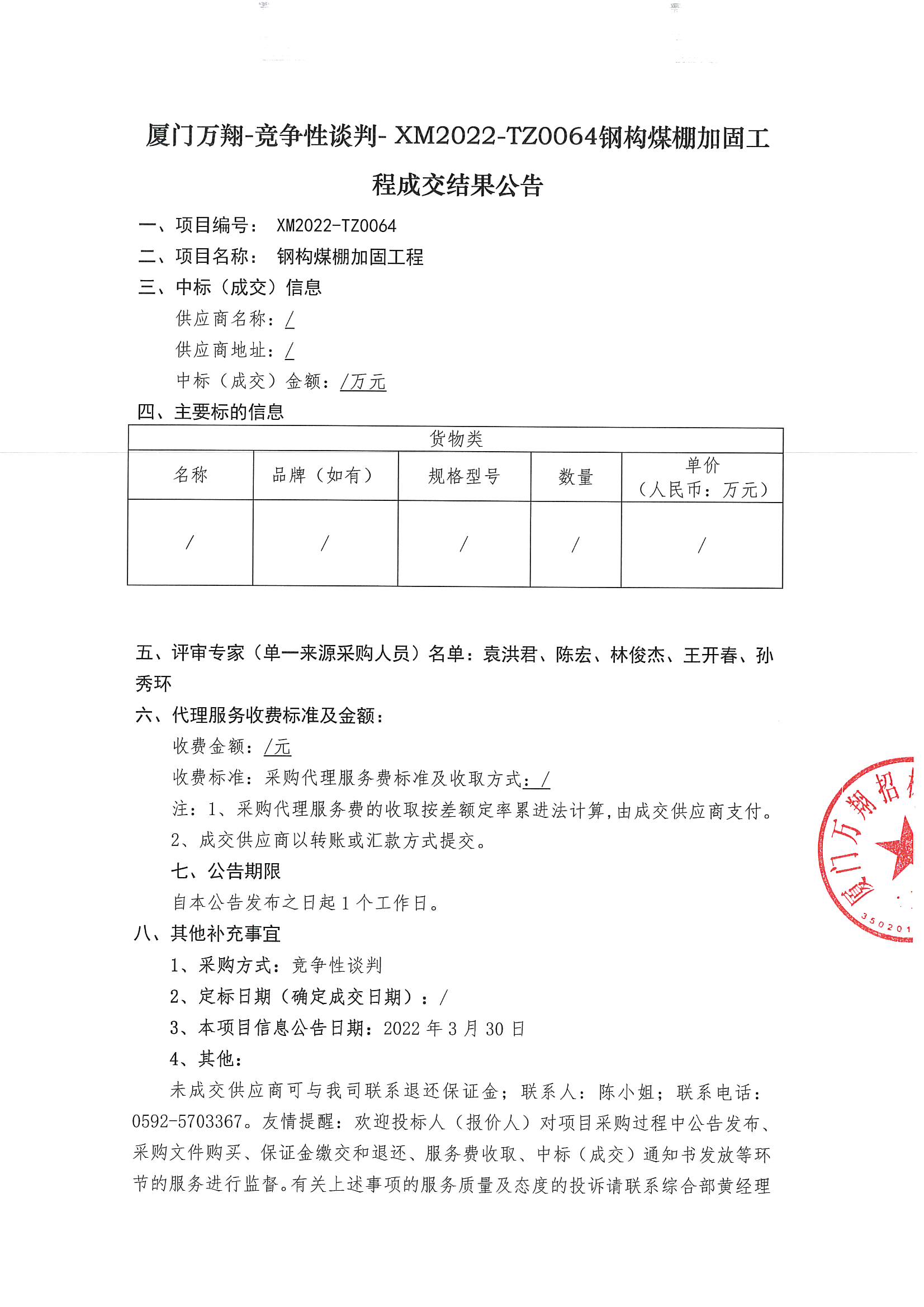 廈門萬翔-競爭性談判-XM2022-TZ0064鋼構煤棚加固工程成交結果公告